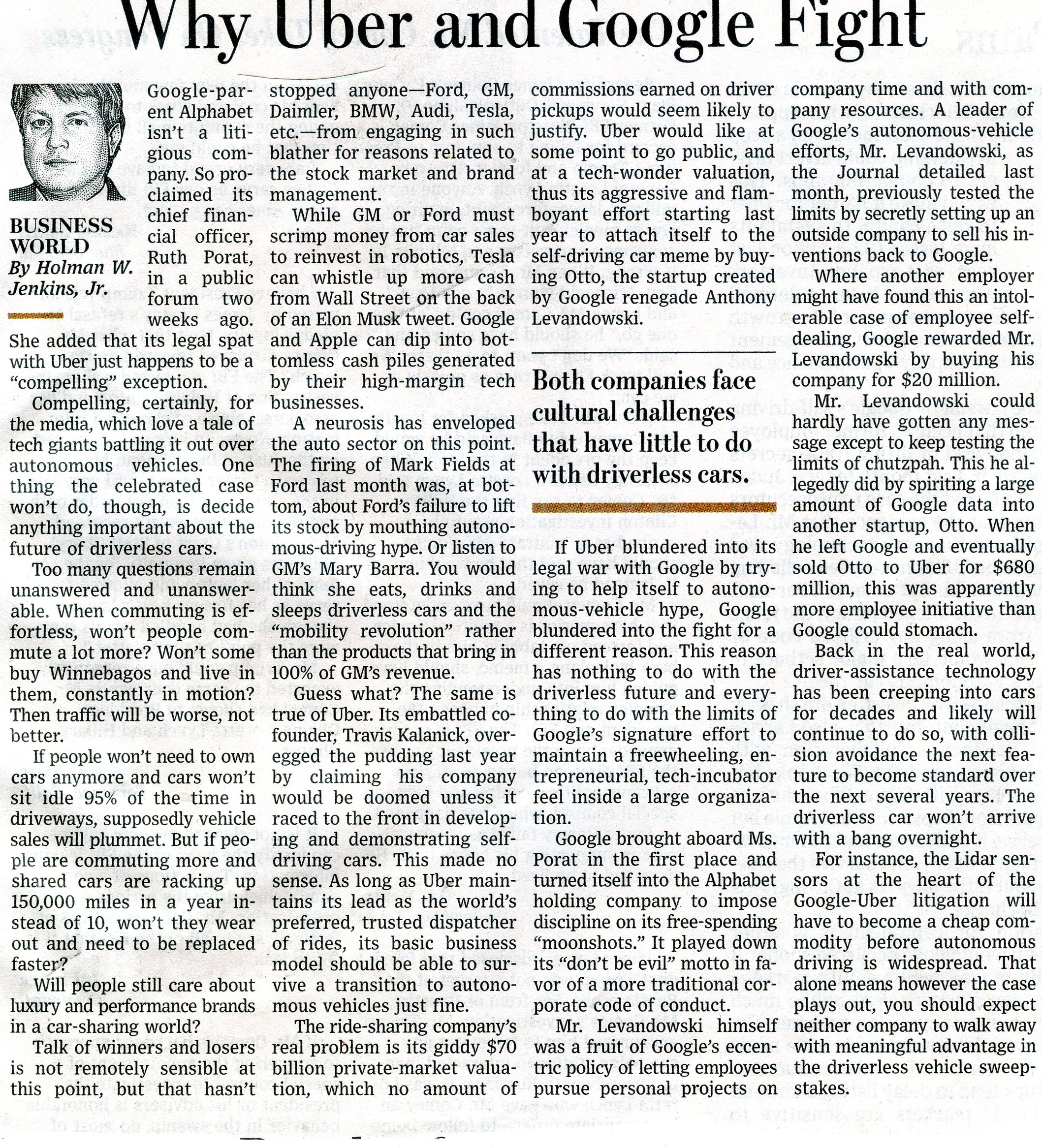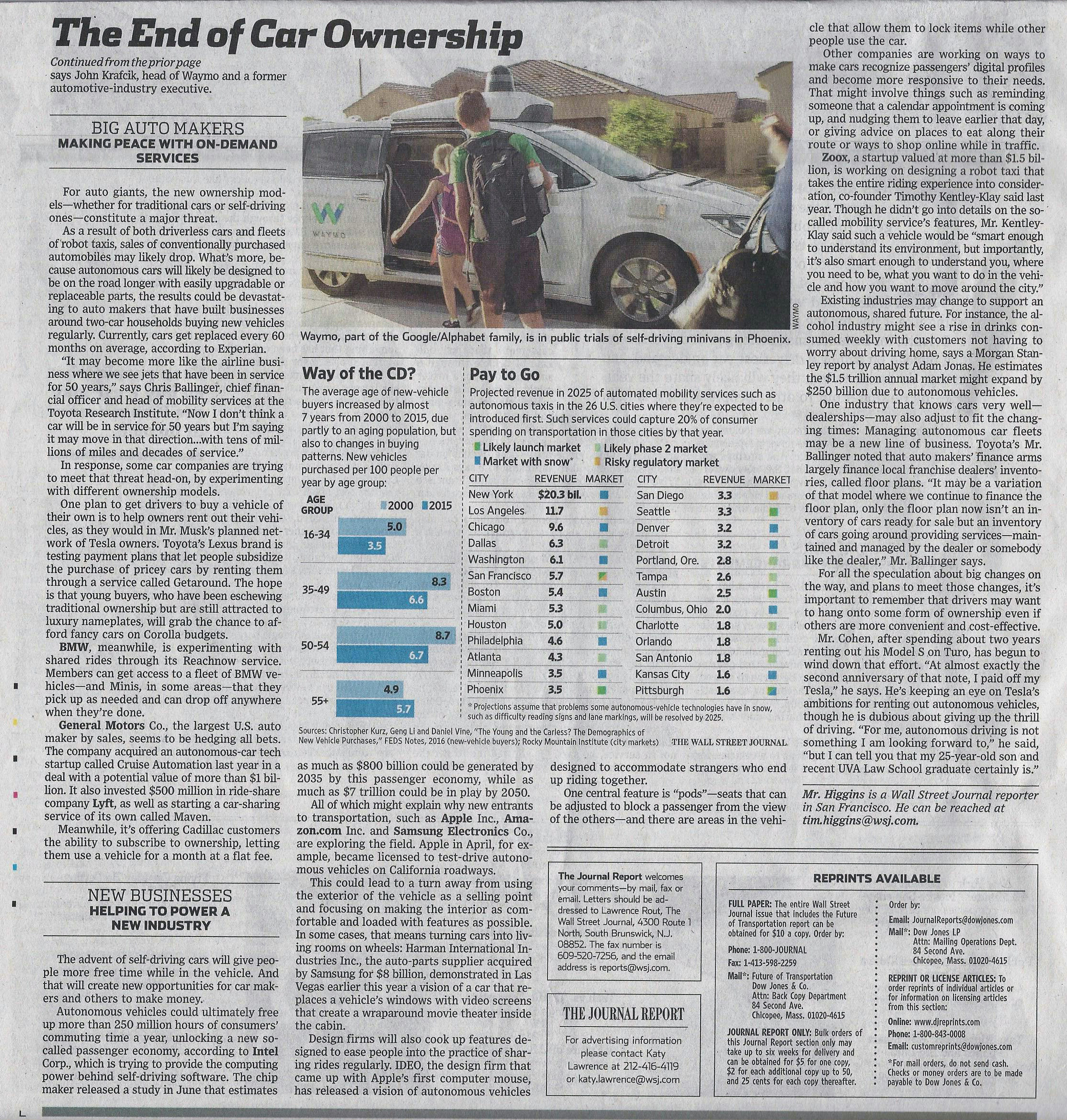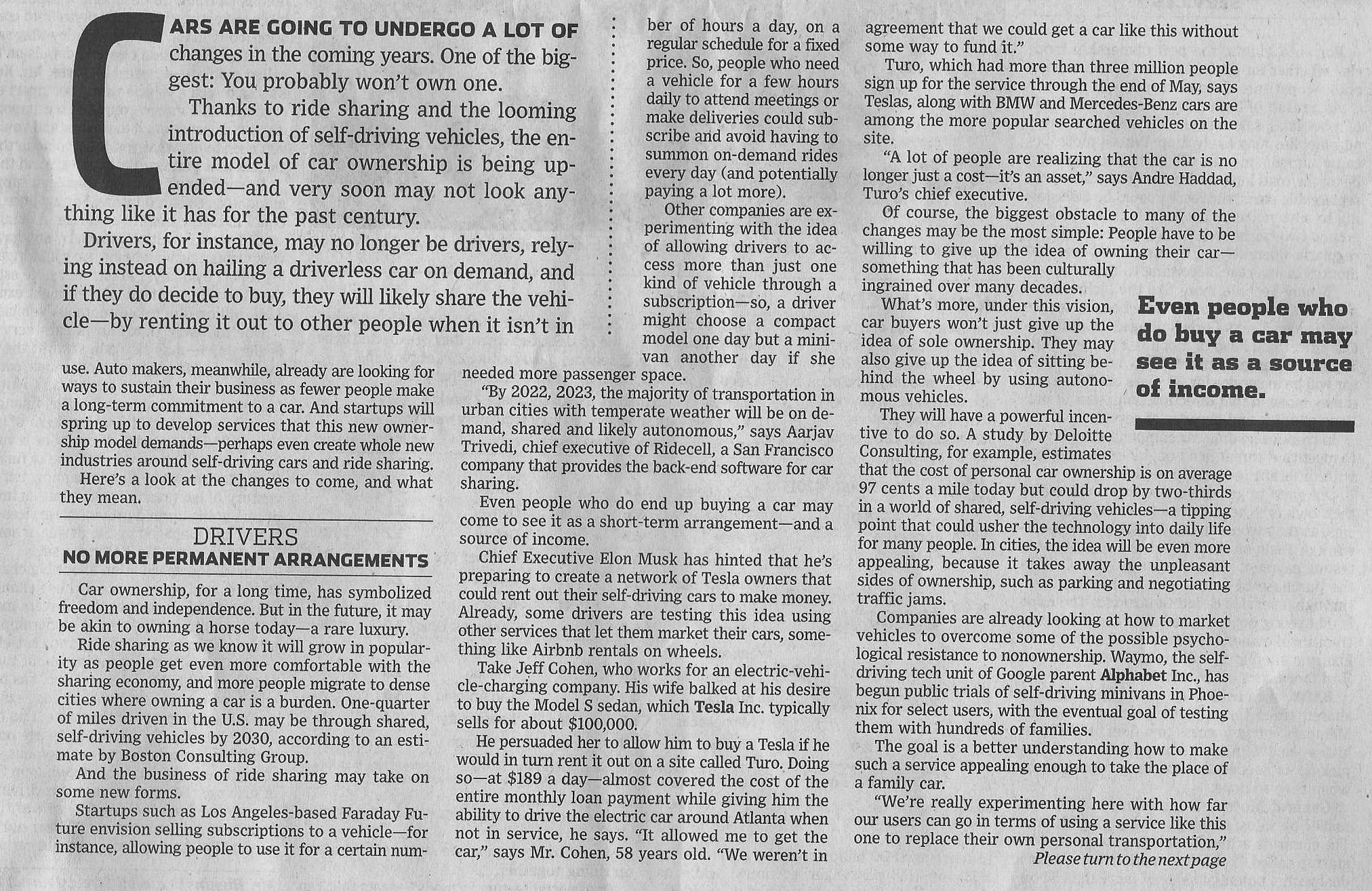 The first article (See s400 and s400a) is from the September 28, 2013 issue of the Wall Street Journal. It’s quiet an extensive article. The next articles (See s402) is from the June 14, 2017 issue of the Wall Street Journal and is an editorial that gives another and different opinion on the direction we’re headed in this country. The next article (See s403) is from the June 19, 2017 issue of the WSJ and it shows the struggle that traditional auto manufacturers are having in dealing with the autonomous vehicle. Just yesterday, June 21, 2017 the WSJ came out with a section titled The Future of Transportation which has articles that covered just about everything but I’ve only included two of them (See s404, 404a, s404b, and s405) to conclude this blog.